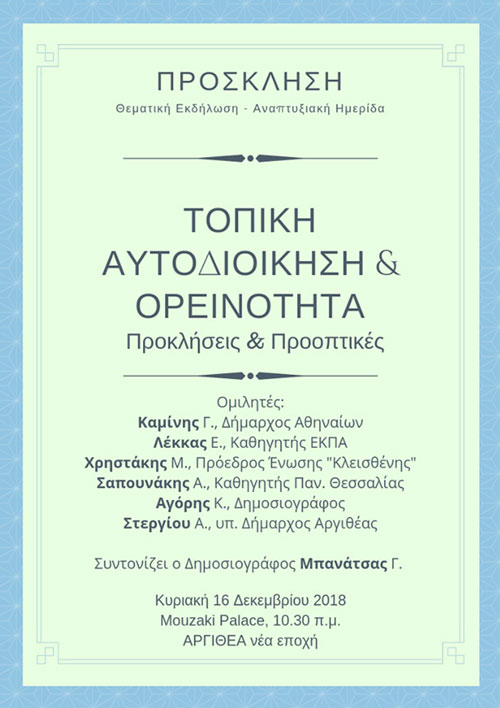 Την Κυριακή 16 Δεκεμβρίου 2018 & ώρα 10.30 π.μ. πραγματοποιήθηκε στο Μουζάκι, Καρδίτσας (στο ξενοδοχείο Mouzaki Palace) θεματική εκδήλωση – αναπτυξιακή ημερίδα με τίτλο: «ΤΟΠΙΚΗ ΑΥΤΟΔΙΟΙΚΗΣΗ & ΟΡΕΙΝΟΤΗΤΑ: Προκλήσεις και προοπτικές».