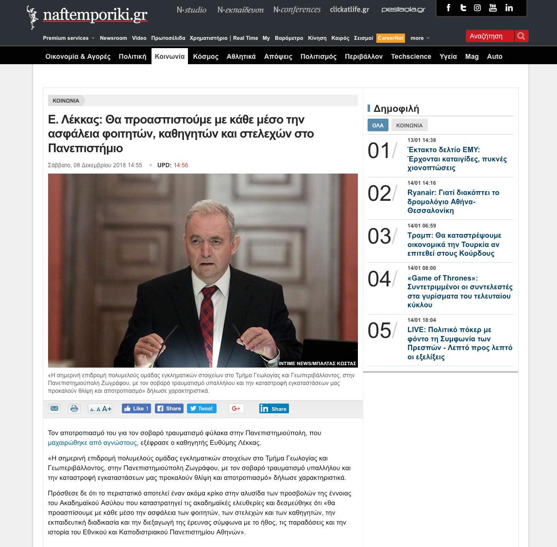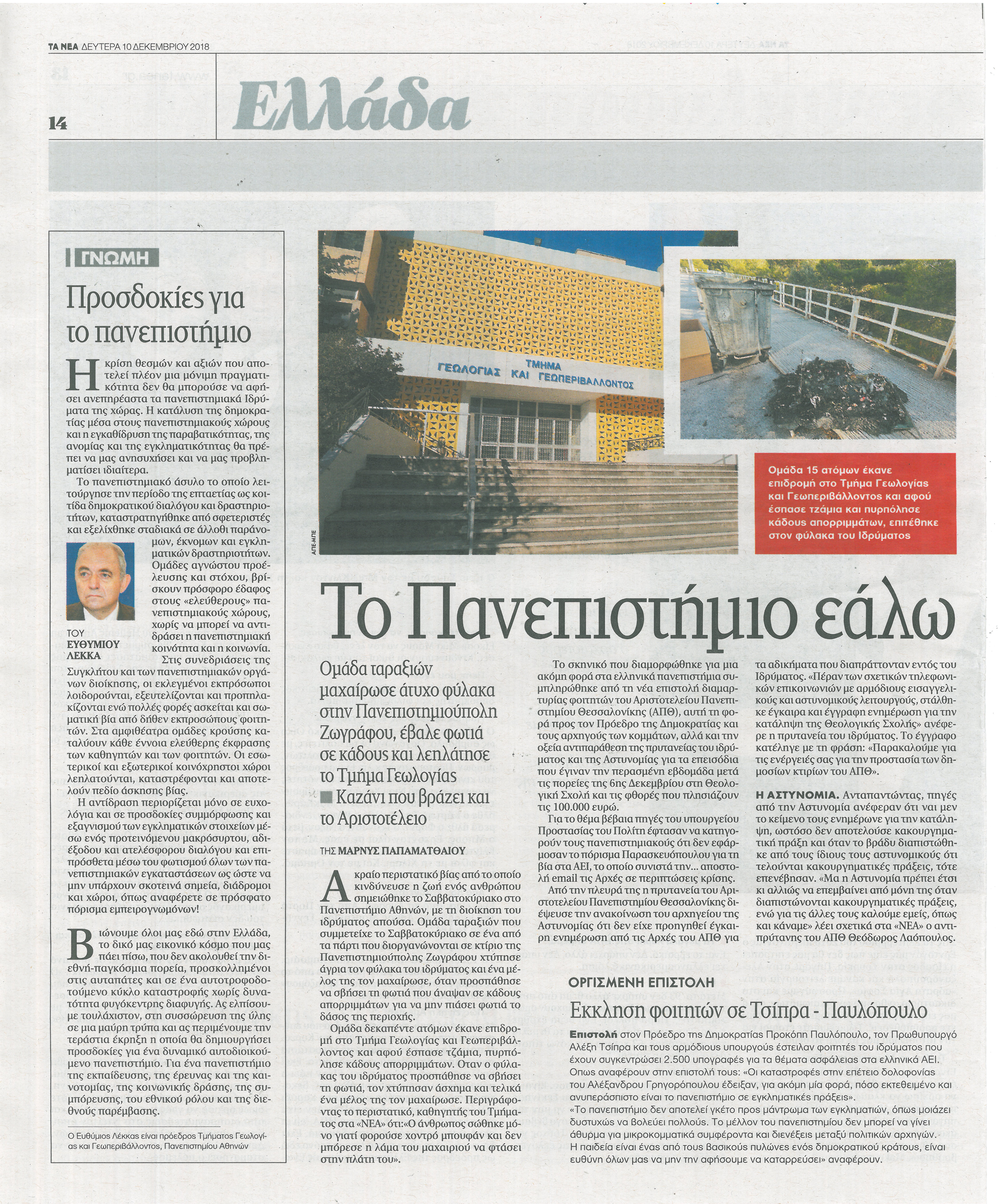 Δηλώσεις σχετικά με τον σοβαρό τραυματισμό υπαλλήλου και την καταστροφή εγκαταστάσεων στο Τμήμα Γεωλογίας και Γεωπεριβάλλοντος, στην Πανεπιστημιούπολη Ζωγράφου.